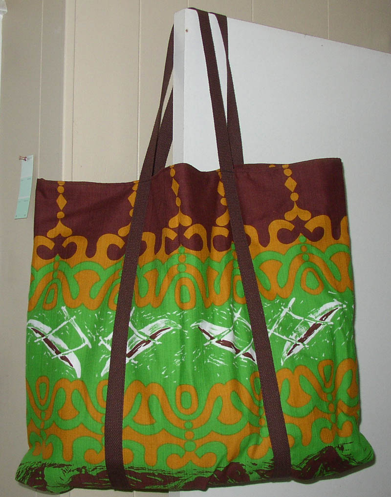 I am not sure, but I want to say I got this as a gift when I either subscribed to a new magazine years ago, OR more likely it was when I joined the San Jose Museum of Quilts and Textiles as a member when it first opened. (Shame on me, I never actually visited this place when I lived in San Jose!!!)The fabric is about two yards of some type of bark-cloth. I have had it for many years and really never could figure out what to do with it. That is, until last weekend! I took the fabric and folded it over with right sides together and stitched all around. I left a small opening so I could turn it right side out and then pressed the seams.